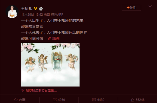 網(wǎng)易娛樂12月1日報道 11月29日,浙江衛(wèi)視主持人王利發(fā)文稱:“一個人出生了,人們并不知道他的未來,卻說恭喜恭喜。一個人死去了,人們并不知道死后的世界,卻說可惜可惜。”