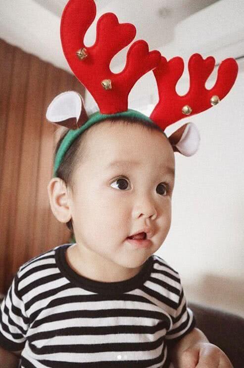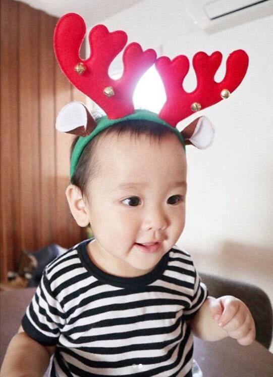 10個(gè)月大的鄭承悅身穿黑白條紋短袖T恤,頭上戴著大大的麋鹿角頭箍,再配上甜滋滋的笑容化身小麋鹿,寶寶看上去十分健康活潑。