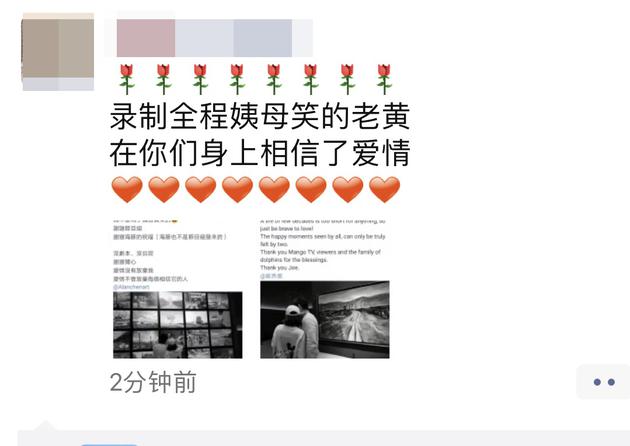 稍晚,陳喬恩經(jīng)紀(jì)人也在朋友圈發(fā)文:“錄制全程姨母笑的老黃,在你們身上相信了愛情。”(老黃指陳喬恩經(jīng)紀(jì)人)