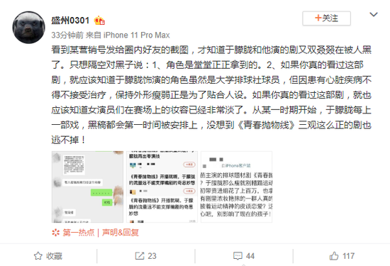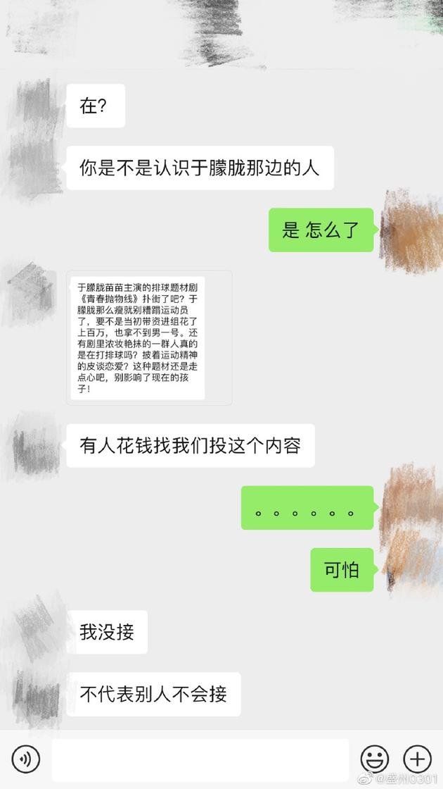 看到某營銷號發給圈內好友的截圖,才知道于朦朧和他演的劇又雙叒叕在被人黑了。只想隔空對黑子說:1、角色是堂堂正正拿到的。2、如果你真的看過這部劇,就應該知道于朦朧飾演的角色雖然是大學排球社球員,但因患有心臟疾病不得不接受治療,保持外形瘦弱正是為了貼合人設。如果你真的看過這部劇,就也應該知道女演員們在賽場上的妝容已經非常淡了。從某一時期開始,于朦朧每上一部戲,黑稿都會第一時間被安排上,沒想到《青春拋物線》三觀這么正的劇也逃不掉!