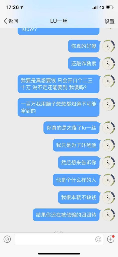 lu一絲還放出她與女方的對峙過程,聲稱對方此舉是為了敲詐勒索自己100萬,出軌一事完全是捏造。