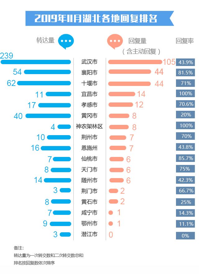 11月1日至30日,《荊楚問政》共收到64條留言,其中有效留言35條,欄目組已向相關部門轉交63條留言,含二次轉交留言28條(荊楚網《荊楚問政》欄目正在將此前未回復的留言進行二次轉交),20條留言獲得相關部門回復。