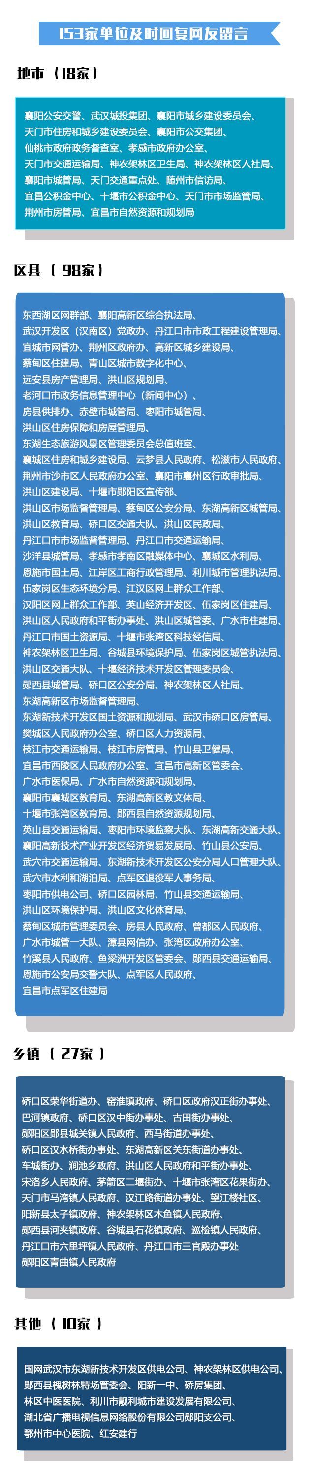 湖北省內各入駐單位及時回復網友留言,響應群眾關切,欄目組代表廣大網友表示誠摯感謝!同時,因各種原因,還有部分留言沒有得到及時回復,如有回音,請在《民生熱線》《荊楚問政》中及時給予回復。