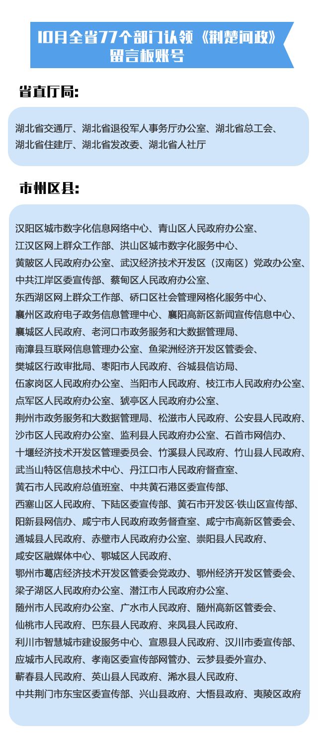 同時,《荊楚問政》欄目組歡迎全省市州區縣各級部門積極認領《荊楚問政》賬號,主動回應網友投訴及咨詢,真正做到“問政于民、問計于民”。