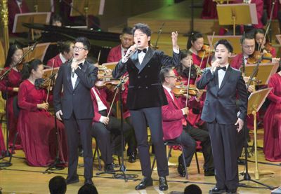 《抒情新時(shí)代》慶祝中華人民共和國(guó)成立70周年新創(chuàng)主題歌曲音樂(lè)會(huì)在京上演 12月2日,《抒情新時(shí)代》慶祝中華人民共和國(guó)成立70周年新創(chuàng)主題歌曲音樂(lè)會(huì)在北京音樂(lè)廳上演,藝術(shù)家們演唱了18首新創(chuàng)歌曲。為了更好地完成這批主題歌曲的創(chuàng)作任務(wù),來(lái)自全國(guó)各地的近百名藝術(shù)家從西柏坡出發(fā),到延安、古田、湘江、瑞金、井岡山等地采風(fēng),并將這些體驗(yàn)寫(xiě)進(jìn)了音樂(lè)旋律之中。圖為王凱(前中)、廖佳琳(前左)、趙越(前右)演唱《祖國(guó)正青春》。