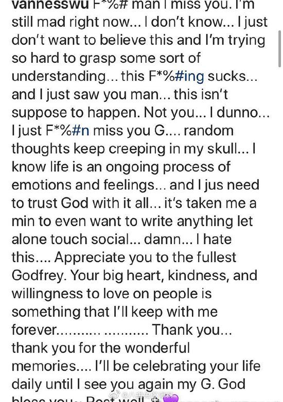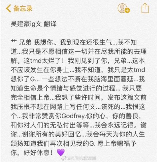 網易娛樂12月4日報道 35歲演員高以翔的突然離世令其親人好友及粉絲都悲痛不已,12月3日深夜,吳建豪發文緬懷好友高以翔,他表示自己很想念好兄弟,到現在還很生氣,更直呼“這太爛了”、“不愿相信這一切”、“這本不應該發聲再你身上”。吳建豪稱自己和高以翔才剛見過,他很贊賞高以翔的心、高以翔的善良,以及高以翔對人們的無私付出等等,他會永遠記得好兄弟,會每天為好友的人生頌揚直到他們再次相見,并希望高以翔可以好好休息。