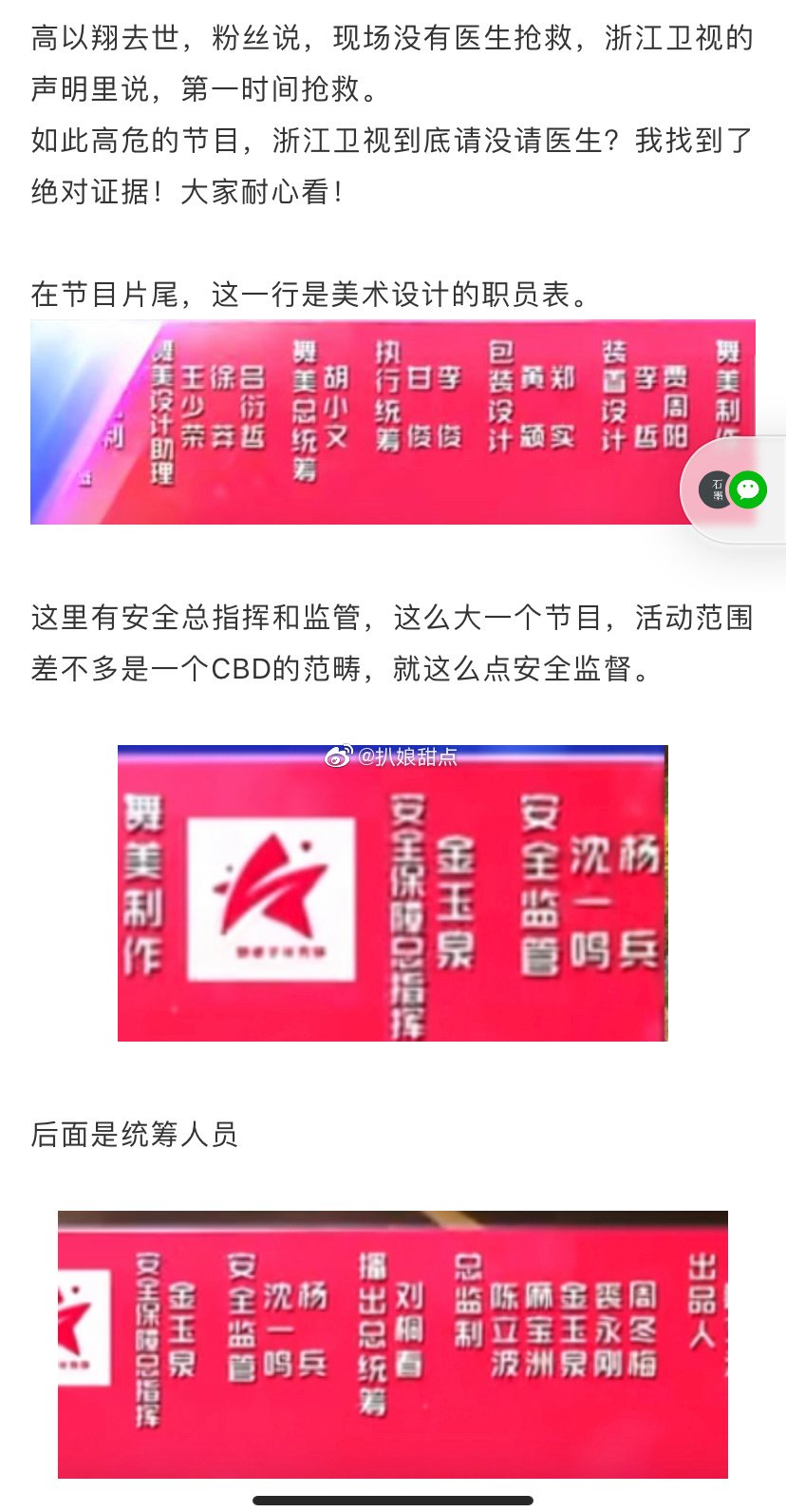 高以翔粉絲后援會發(fā)出20問要求電視臺出面說清楚,3日還有網(wǎng)友翻看該節(jié)目片尾會出現(xiàn)工作人員、合作單位、贊助廠商名單,控訴該節(jié)目根本沒有現(xiàn)場急救醫(yī)生,也沒有和醫(yī)院、及保險公司有合作!該網(wǎng)友表示,找尋了與《追我吧》同類型的節(jié)目,其最后羅列的名單中就有保險公司。