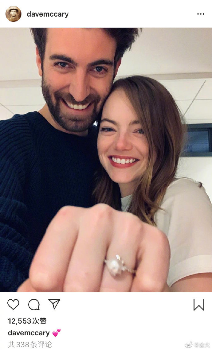 網(wǎng)易娛樂(lè)12月5日?qǐng)?bào)道 5日,“石頭姐”艾瑪·斯通的男友戴夫·麥卡里在社交平臺(tái)曬出兩人依偎在一起的照片,并配以愛(ài)心表情宣布訂婚喜訊。照片中,石頭姐笑容燦爛,手上戴著一個(gè)大大的鉆戒。據(jù)悉,“石頭姐”男友為《SNL》的節(jié)目編劇、導(dǎo)演,兩人于2017年傳出戀情。恭喜!