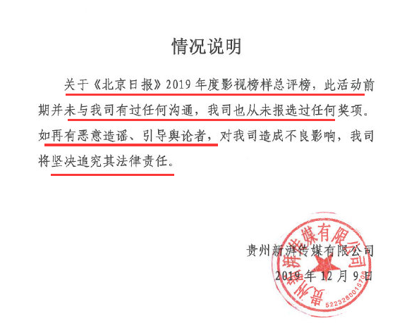 當晚,《陳情令》劇方新湃傳媒發布聲明反擊,表示《北京日報》這個評選活動前期沒有和公司有過任何溝通,公司也沒有報選過任何獎項。如果再有惡意造謠、引導輿論者,對公司造成不良影響,將堅決追求法律責任。
