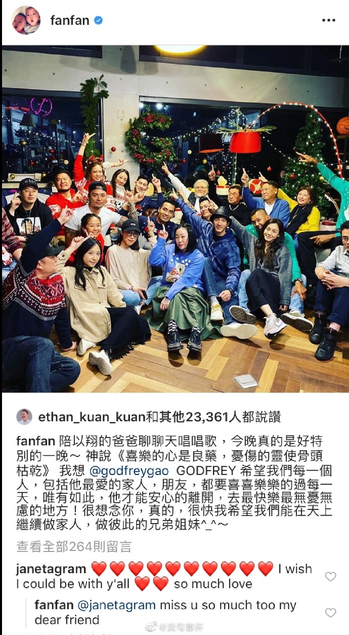 網易娛樂12月11日報道 近日,范瑋琪在社交平臺曬出了和高以翔爸爸過圣誕的合照,出現在同一派對的還有王力宏、潘瑋柏、毛加恩夫妻等,范瑋琪在文中寫道:“陪以翔的爸爸聊聊天唱唱歌,今晚真的是好特別的一晚”,“GODFREY希望我們每一個人,包括他最愛的家人,朋友,都要喜喜樂樂的過每一天,唯有如此,他才能安心的離開,去最快樂最無憂無慮的地方!很想念你,真的,很快我希望我們能在天上繼續做家人,做彼此的兄弟姐妹”。