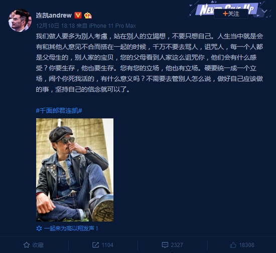 網易娛樂12月11日報道 12月10日,演員連凱在微博發文稱“我們做人也要多為別人考慮,站在別人的立場想,不要只想自己。”“不需要去管別人怎么說,做好自己應該做的事,堅持自己的信念就可以了”,疑似是對9日夏河對高以翔去世事件所發布的長文而發聲。