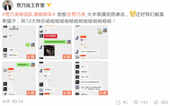 網(wǎng)易娛樂12月12日?qǐng)?bào)道 今天是雙十二,凌晨賈乃亮工作室分享聊天記錄截圖,并寫道“老板大半夜搞突然襲擊,還好我們都是夜貓子,雙12大快樂”。截圖中,賈乃亮讓團(tuán)隊(duì)工作人員在30秒內(nèi)提供購物車截圖,自己要幫大家清空,可以說是很寵員工的老板了。事后,他還留言“只是沒想到還有107件的”,很是逗趣。
