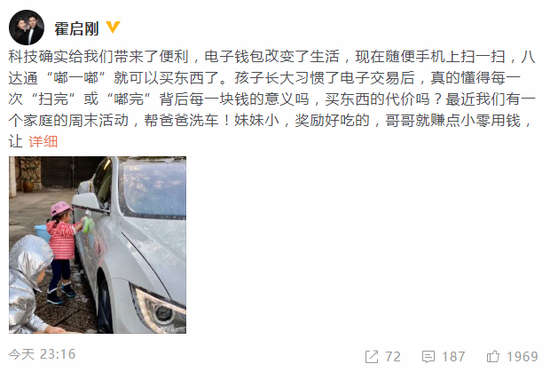 網易娛樂12月12日報道 12月11日晚,霍啟剛在微博分享兒女近照,照片中霍啟剛一對兒女正在洗車,霍啟剛透露了背后原因“最近我們有一個家庭的周末活動,幫爸爸洗車!妹妹小,獎勵好吃的,哥哥就賺點小零用錢”,霍啟剛希望通過這個行動讓孩子們知道“買東西的代價”,表示“不能說見到喜歡就要。不知道這樣做法對不對,也許對他們來講只是玩水的好機會,但是只是希望他們成長能學會珍惜!”