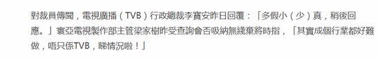 網(wǎng)易娛樂12月12日報道 據(jù)港媒報道,TVB月底將裁員近千人,其中制作部和綜藝組影響最大。據(jù)悉現(xiàn)在TVB所有員工大約有4000人,前段時間就有少量藝人被裁。有媒體就此采訪了TVB行政總裁,他就表示此消息:“多假小真,稍后回應(yīng)。”據(jù)悉這次裁員將會有800到1000名員工被裁。