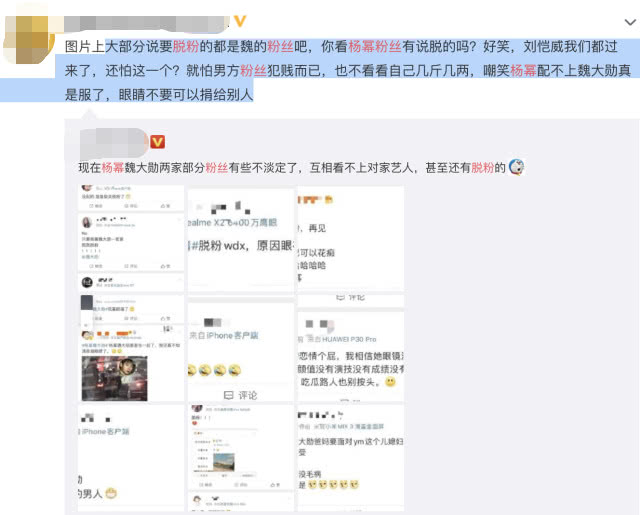 不過也有楊冪的粉絲解釋:大部分說要脫粉的都是魏大勛的粉絲吧,你看楊冪粉絲有說脫的嗎?好笑,劉愷威我們都過來了,還怕這一個?也不看看自己幾斤幾兩,嘲笑楊冪配不上魏大勛真是服了,眼睛不要可以捐給別人。