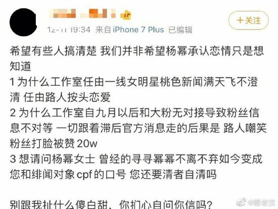 網(wǎng)易娛樂12月12日報道 近日,楊冪被拍到與魏大勛在酒店共度良宵,為兩人戀情傳聞再添實錘。而有楊冪的粉絲不滿偶像處理戀情的模糊態(tài)度,將頭像換成全黑圖片,發(fā)文“質(zhì)問”楊冪,并發(fā)起“楊冪請你坦誠面對粉絲”的話題,以表態(tài)度。
