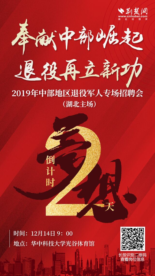 荊楚網客戶端—荊楚網消息(記者邱玲鵬 通訊員包曉霽)12月14日,中部地區退役軍人專場招聘會(湖北)將在華中科技大學光谷體育館舉行。此次專場招聘會以“奉獻中部崛起 退役再立新功”為主題,由退役軍人事務部、湖北省人民政府聯合主辦,旨在拓展退役軍人就業創業空間,推動退役軍人工作發展。