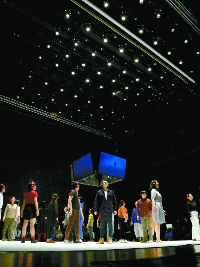 懸掛在舞臺上空正中區(qū)域的四面電子屏以及地面四邊中間位置的電腦上出現(xiàn)的照片或視頻,從20多位素人演員、他們偶像的某次定格,過渡到媒介眼中各行各業(yè)的風云人物、人類集體圍觀的文體活動的某個瞬間,再到漫畫、游戲里的虛擬形象、像素人物,均可視為時代與媒介聯(lián)合筑造的景觀。