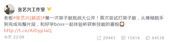 12月12日晚,張藝興工作室在微博分享了一段張藝興的日常視頻,并配文:“第一次架子鼓挑戰大公開!首次嘗試打架子鼓,從棒槌脫手到完成完整片段,和好學boss一起體驗斬獲新技能的喜悅!”視頻中,張藝興身穿紅色外套清爽帥氣,迅速get架子鼓新技能。視頻最后工作人員問張藝興還有什么不會的嗎,張藝興幽默回復:“不會談戀愛。”