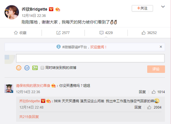 網易娛樂12月16日報道 12月14日 喬欣在微博回懟網友稱其買通稿的評論:“天天買通稿,演員沒這么閑”。