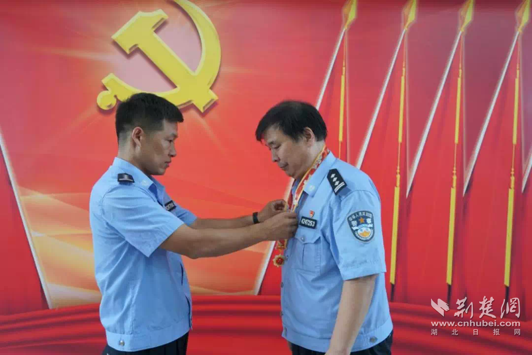 省沙洋漢津監獄黨委副書記、政委汪少波(左)代表該監獄黨委為全國先進工作者沈新強(右)頒發“慶祝中華人民共和國成立70周年”紀念章。省沙洋漢津監獄供圖
