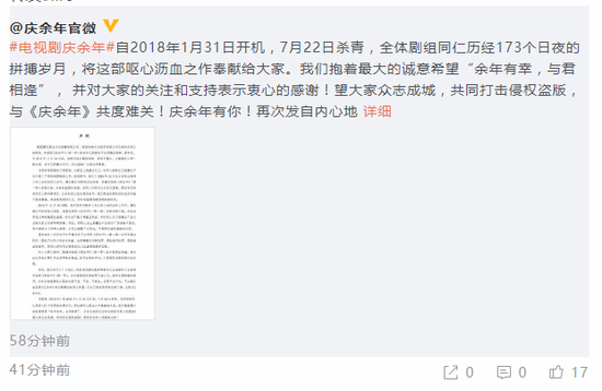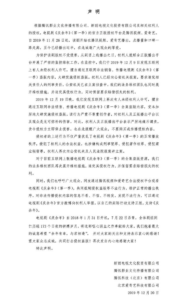 網(wǎng)易娛樂12月20日報(bào)道 12月20日,劇方對于《慶余年》遭全集泄漏發(fā)出聲明,表示將追究相關(guān)責(zé)任人的刑事責(zé)任。針對大肆實(shí)施侵權(quán)盜版一事,騰訊影業(yè)公司回應(yīng)稱,權(quán)利人已經(jīng)向公安機(jī)關(guān)報(bào)案,要求追究相關(guān)責(zé)任人的刑事責(zé)任,公安機(jī)關(guān)已在立案偵查中。