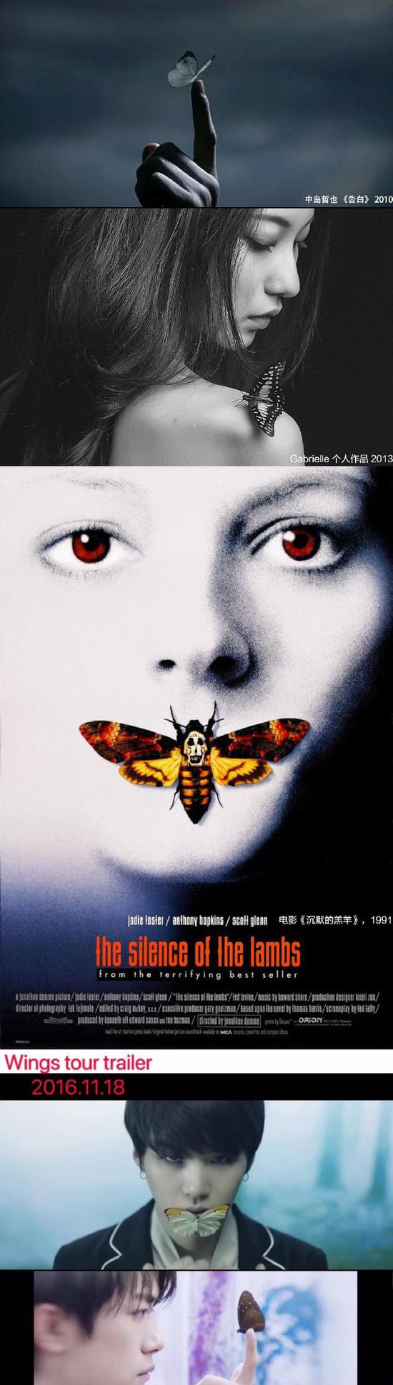 網友指出同樣有蝴蝶元素的發布于2016年11的Wings演唱會預告畫面中,男孩唇上停駐著蝴蝶。1991年的電影《沉默的羔羊》的經典海報有過類似的畫面。