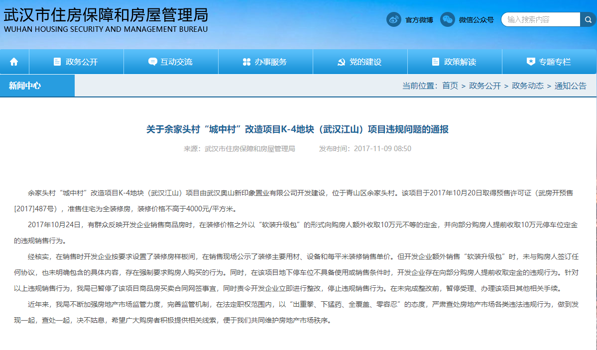 經(jīng)了解,2017年11月9日,武漢市房管局發(fā)布《關(guān)于余家頭村“城中村”改造項(xiàng)目K-4地塊(武漢江山)項(xiàng)目違規(guī)問(wèn)題的通報(bào)》,通報(bào)稱(chēng),武漢江山在裝修價(jià)格之外以“軟裝升級(jí)包”的形式向購(gòu)房人額外收取10萬(wàn)元不等的定金,并向部分購(gòu)房人提前收取10萬(wàn)元停車(chē)位定金。針對(duì)以上違規(guī)銷(xiāo)售行為,武漢市房管局已暫停了該項(xiàng)目商品房買(mǎi)賣(mài)合同網(wǎng)簽事宜,同時(shí)責(zé)令開(kāi)發(fā)企業(yè)立即進(jìn)行整改,停止違規(guī)銷(xiāo)售行為。
