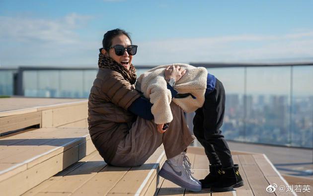 照片中,劉若英戴著墨鏡,圍著豹紋花色的圍巾,坐在臺階上,調皮的兒子彎腰站在媽媽對面,并將頭埋在媽媽的懷里撒嬌玩鬧,逗得劉若英開心大笑,畫面非常的溫馨幸福。