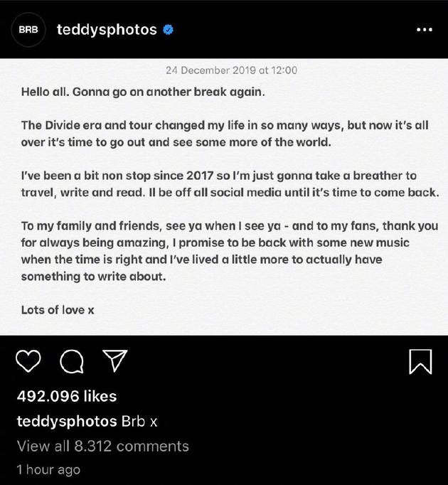 網易娛樂12月25日報道 12月24日,黃老板艾德·希蘭(Ed Sheeran)在社交軟件上正式發文表示將暫別樂壇,他稱:“從2017年到現在,從未停歇。所以打算休息一段時間,去旅行、創作和閱讀,同時也將離開社交網絡,直到下次回歸。”