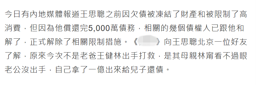 12月24日晚,港媒采訪了王思聰的一位好友,了解到這次讓王思聰脫離困境的不是父親王健林,而是母親林寧。