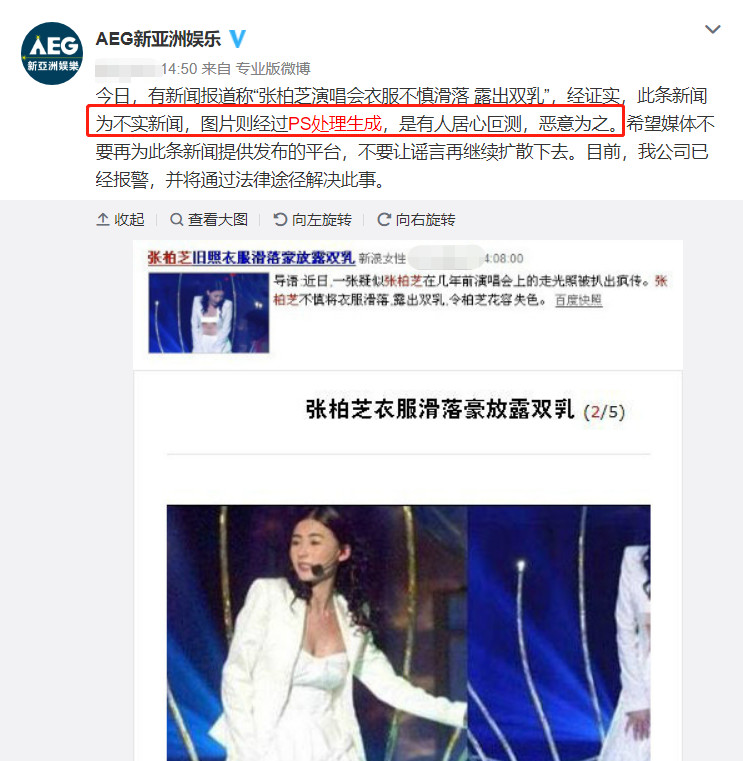 對此,張柏芝所屬的公司“AEG新亞洲娛樂”出面澄清,并曬出張柏芝演唱會的原圖,表示張柏芝演唱會走光是不實(shí)傳聞,圖片是經(jīng)過PS處理生成,是有人惡意為之。