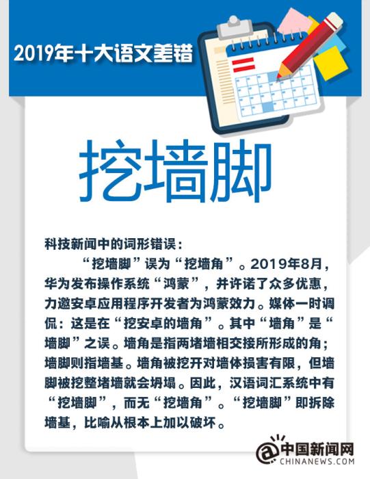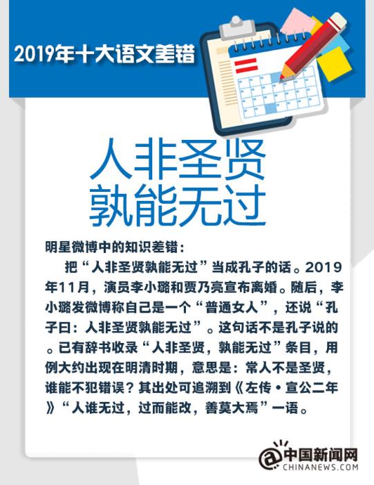 中新網客戶端北京12月25日電(記者 上官云)今天,2019年“十大語文差錯”公布,很快引發關注。其中,包括明星微博中的知識差錯,把“人非圣賢孰能無過”當成孔子的話;足協致歉聲明中的成語誤用,誤將“差強人意”當作“讓人不滿意”用了。