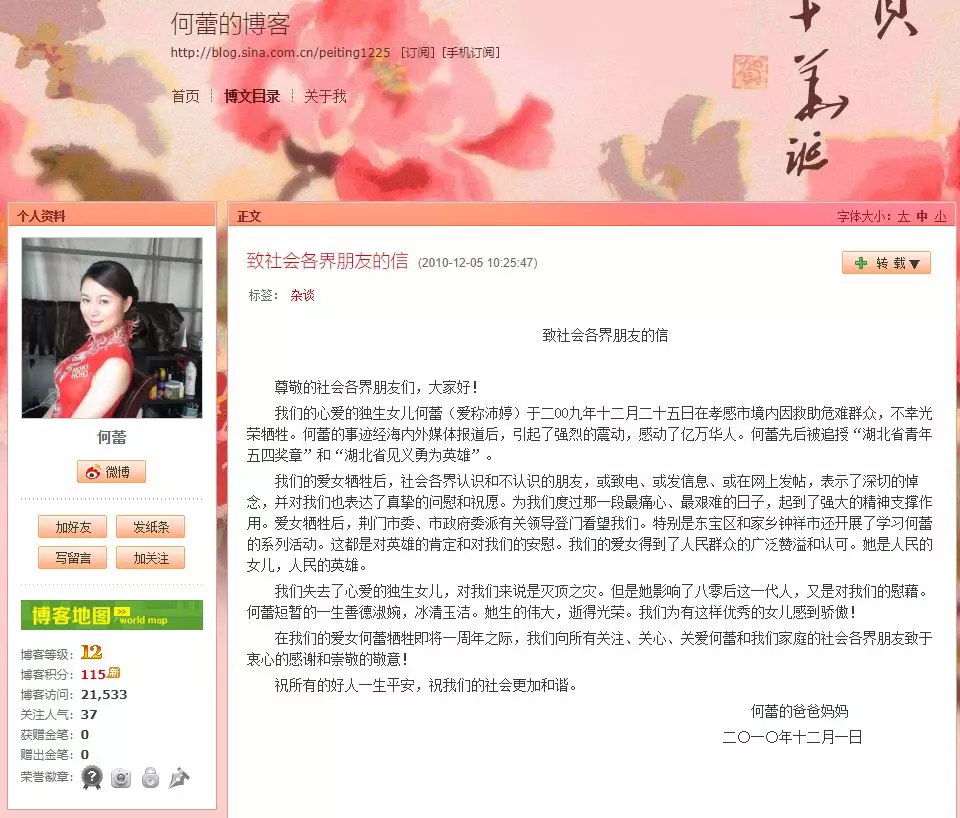 你光明的人格,奉獻的精神感動了大地。大家說你是豐樂人民的好女兒!你是鐘祥的好女兒!你是荊門人民的驕傲!你是湖北的好女兒!你更是我最親愛最驕傲的好女兒。你用你的大愛譜寫了一曲80后這一代人精神風貌的贊歌!我們為你自豪!