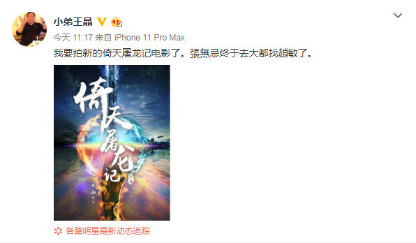 12月21日,導(dǎo)演王晶在個(gè)人社交平臺(tái)曬出一張海報(bào),表示自己將拍新的《倚天屠龍記》電影,“張無忌終于去大都找趙敏了”。
