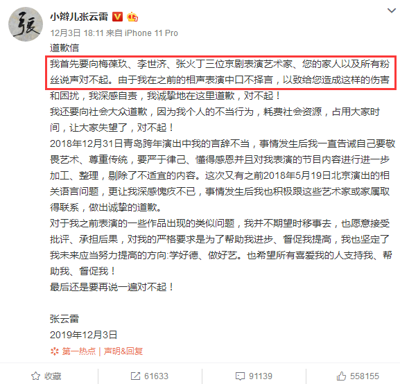 12月3日,張?jiān)评装l(fā)文就調(diào)侃京劇藝術(shù)家一事道歉,“向梅葆玖、李世濟(jì)、張火丁三位京劇表演藝術(shù)家、您的家人以及所有粉絲說聲對(duì)不起,我深感自責(zé)”,同時(shí)他還向社會(huì)大眾道歉,稱讓大家失望了,對(duì)于之前表演的一些作品出現(xiàn)類似問題,愿意接受批評(píng)承擔(dān)后果,希望粉絲可以支持督促他。
