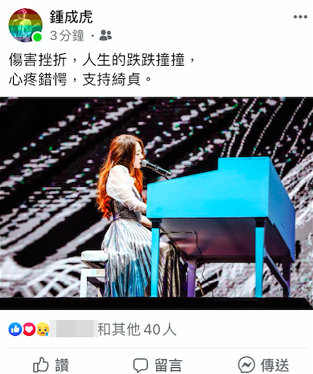 鐘成虎今日13點發文極力維護舊愛陳綺貞