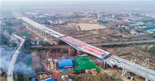 荊楚網客戶端-荊楚網消息(記者 趙秀琳 通訊員 石祎瑋、鄭建強)12月26日12時,武漢城市圈環線高速公路大隨至漢十段(簡稱“孝感北段”)跨漢丹鐵路立交橋連續箱梁在完成精確轉體,標志著武漢城市圈環線高速公路最后一道“關口”打通,形成全線閉環。