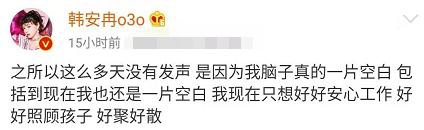 當天,沉默了許久的韓安冉首次在個人社交平臺上發文,稱自己現在只想好好安心工作,好好照顧孩子。