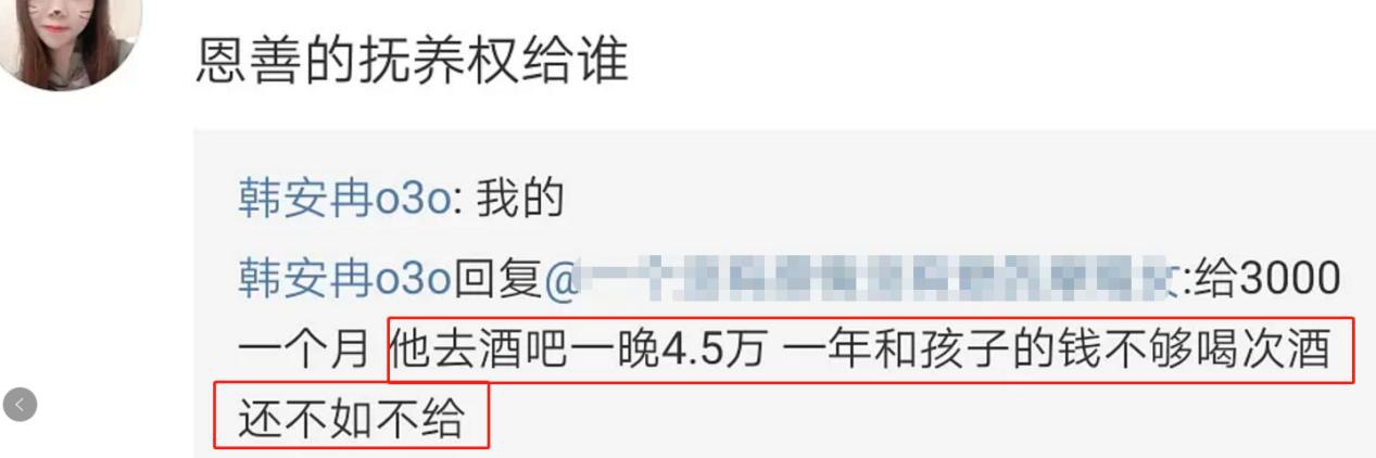沒想到,韓安冉這番話直接引來了前夫的不滿,他很快便在底下回復韓安冉,稱3000元只是保底,賺得多給的多,負責另一半的醫療和教育費用。