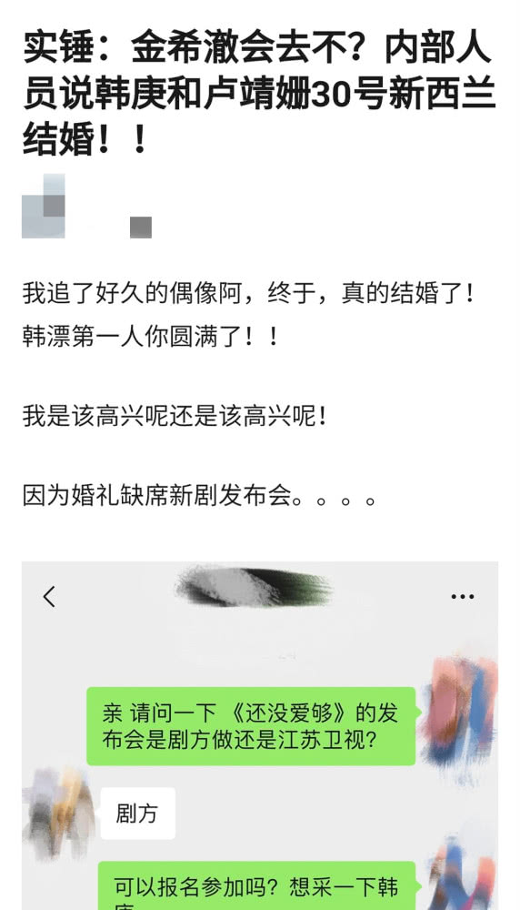 27日,有網友爆料稱韓庚新戲的發布會即將召開,但是韓庚卻會缺席這次的發布會,原因是30號在新西蘭準備婚禮,從曬出的聊天記錄看確實像是內部的工作人員透露。早前也有網友爆料稱韓庚和盧靖姍將于30號在新西蘭舉行婚禮,韓庚的好友金希澈還會擔任伴郎。