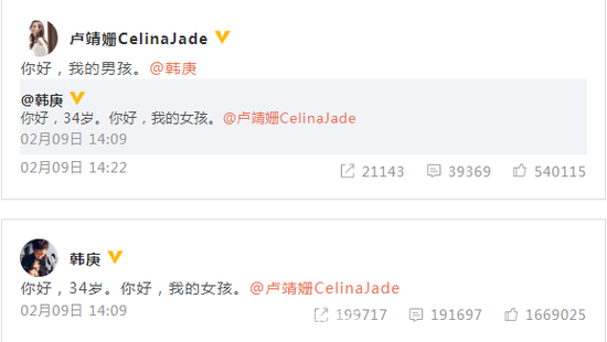 2018年2月9日,韓庚在34歲生日當天在微博發文:“你好,34歲。你好,我的女孩。”并艾特盧婧姍,官宣戀情。直到目前,韓庚和盧婧姍的置頂也一直是此條官宣戀情的微博。