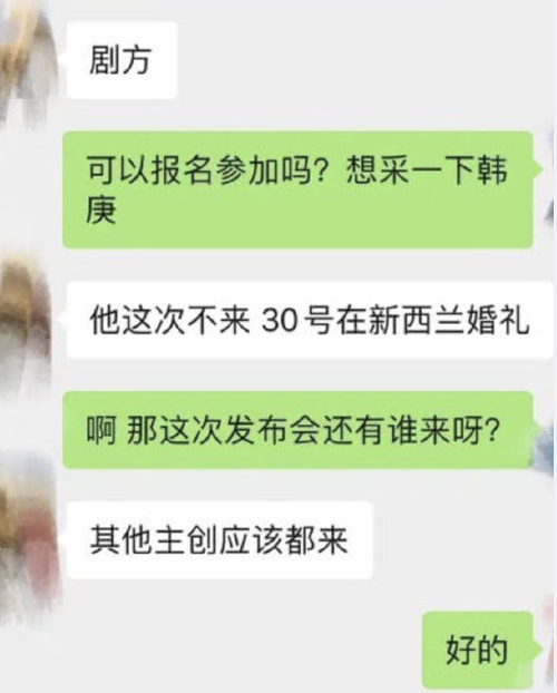 27日,有網友爆料稱韓庚新戲的發布會即將召開,但是韓庚卻會缺席這次的發布會,原因是30號在新西蘭準備婚禮,從曬出的聊天記錄看確實像是內部的工作人員透露。早前也有網友爆料稱韓庚和盧靖姍將于30號在新西蘭舉行婚禮,韓庚的好友金希澈還會擔任伴郎。