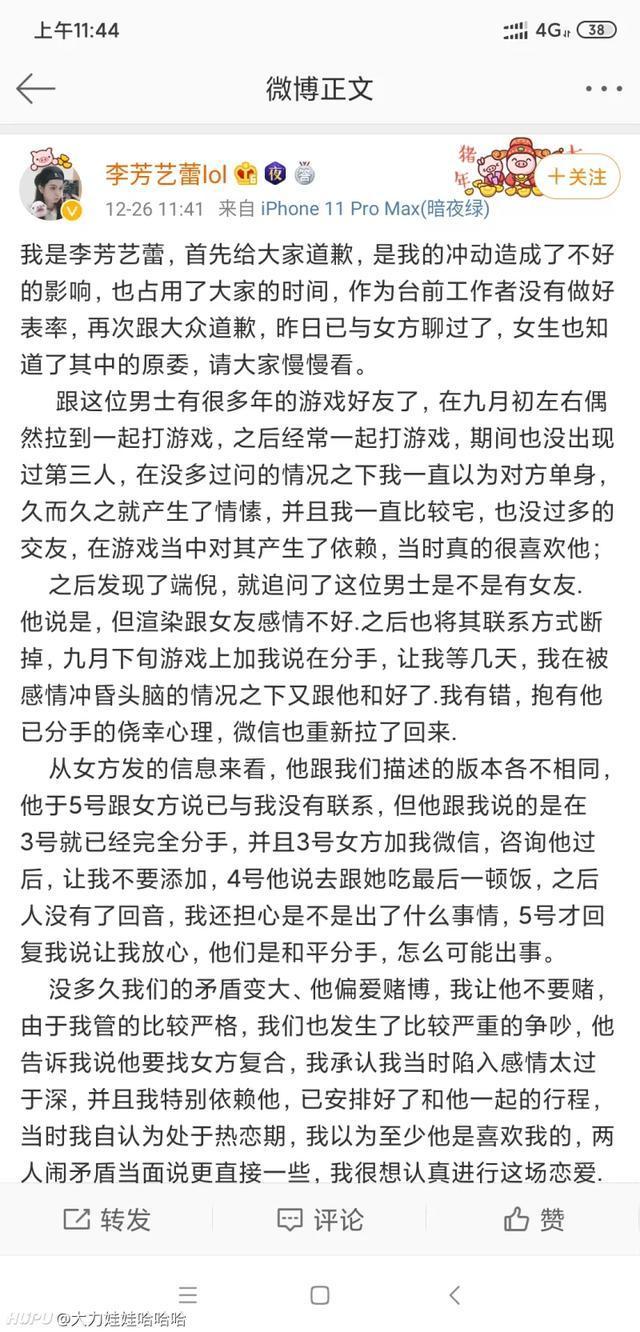 我是李芳藝蕾,首先給大家道歉,是我的沖動造成了不好的影響,也占用了大家的時間,作為臺前工作者沒有做好表率,再次跟大眾道歉,我沒有要介入別人感情當小三,昨日已與女方聊過,女生也知道了其中的原委,具體情況請大家慢慢看。