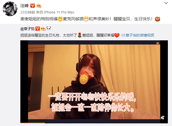 網易娛樂12月27日報道 12月27日,章子怡在網絡上曬出大女兒小蘋果唱生日歌為妹妹慶生的視頻,并發文:“姐姐送給醒寶的生日禮物,太動聽了,愛姐姐,醒醒好幸福!”隨后汪峰轉發:“謝謝姐姐的特別祝福,麥克風夠狠,和聲很美妙!醒醒寶貝,生日快樂!”