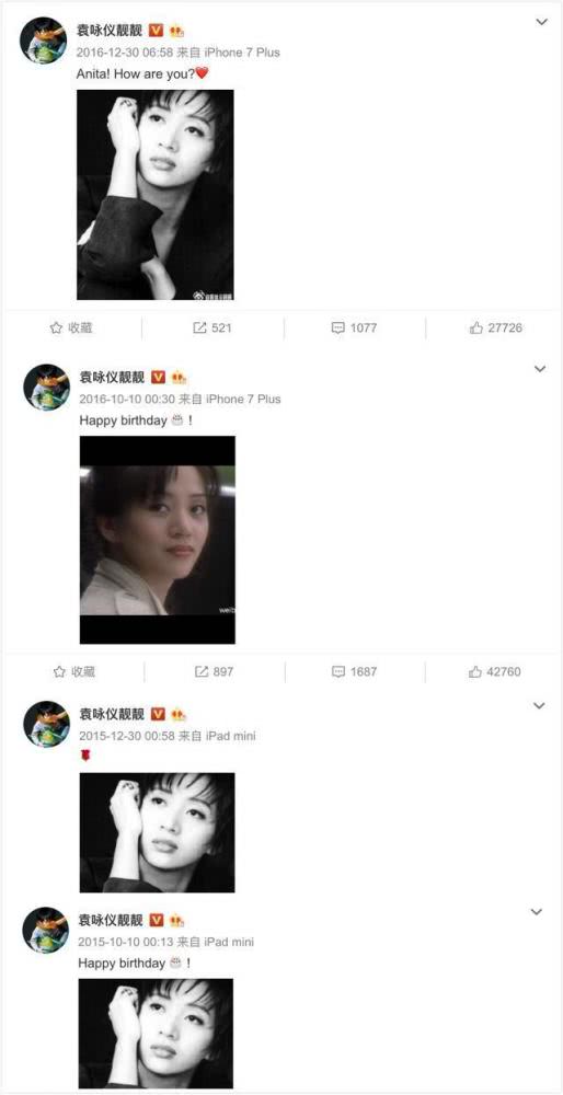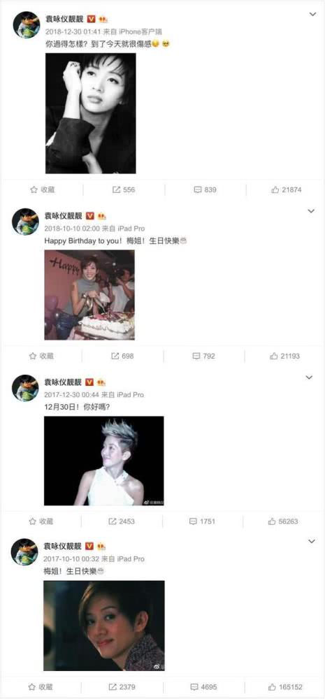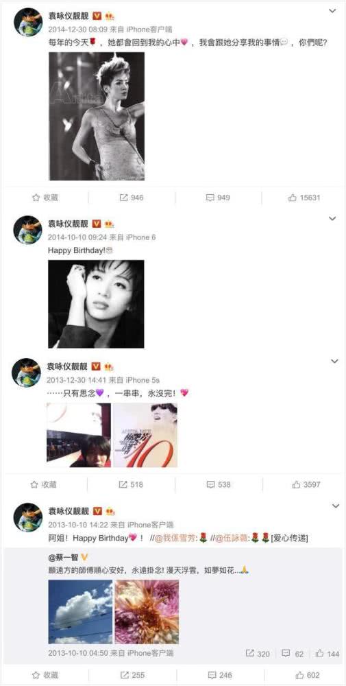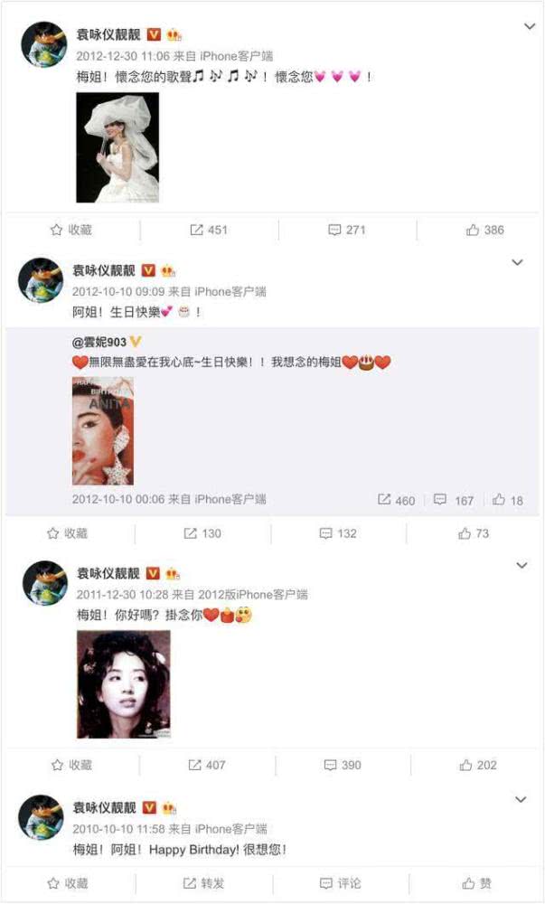 不論是梅艷芳的忌日還是生日,袁詠儀都不忘第一時間發文悼念,每年這個時候的凌晨她都會博緬懷梅艷芳,這個習慣已經持續9年時間。
