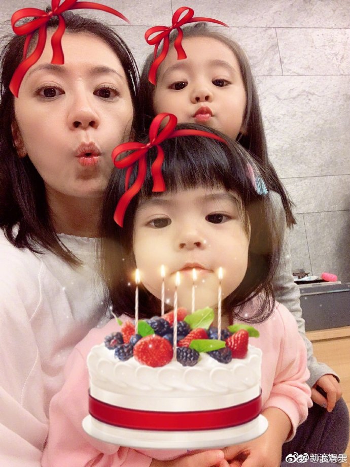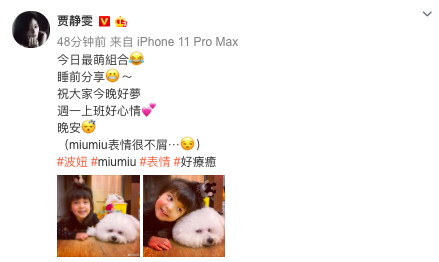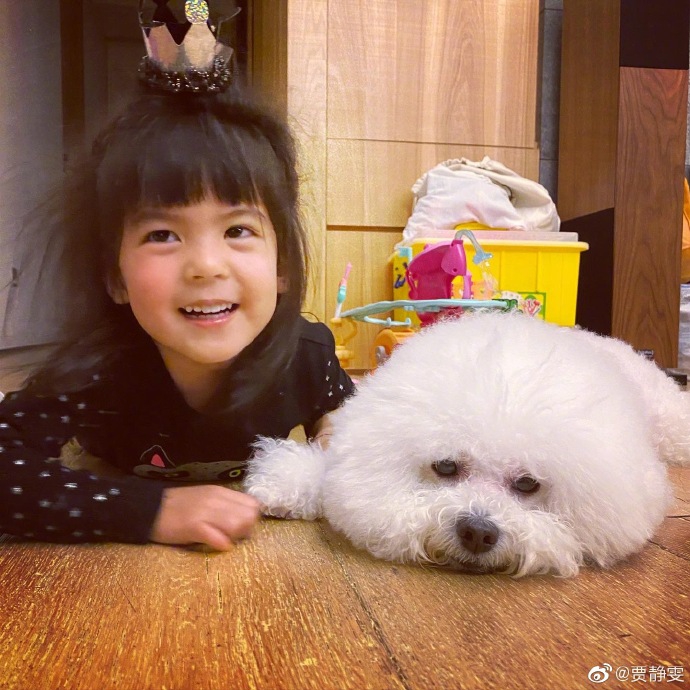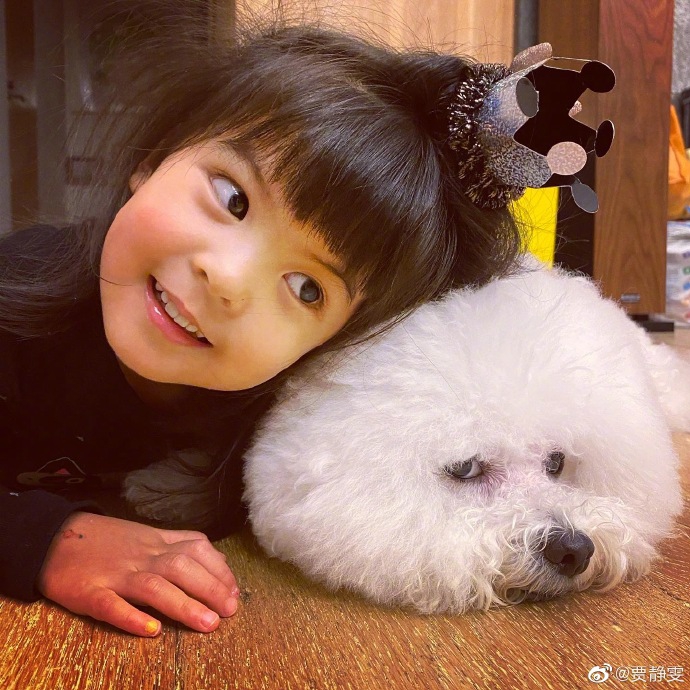 29日晚,賈靜雯分享了女兒波妞與狗狗miumiu的合照。波妞留在齊劉海,綁著半丸子頭,與狗狗合照,表情搞怪可愛。