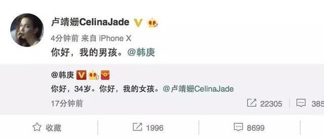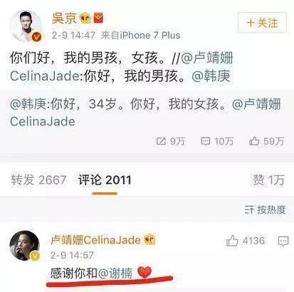 在韓庚與盧靖姍公開戀情時(shí),吳京還特意轉(zhuǎn)發(fā)了二人微博,寫道“你們好,我的男孩,女孩。”