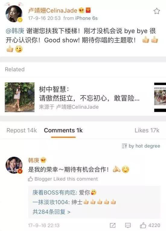 韓庚與盧靖姍結(jié)緣于2017年9月的金雞獎(jiǎng),韓庚紳士一扶,兩人在臺(tái)上各種花式互夸。在活動(dòng)結(jié)束后,盧靖姍也特意發(fā)微博感謝韓庚扶自己下樓梯,韓庚則在評(píng)論區(qū)回復(fù)稱“是我的榮幸”。