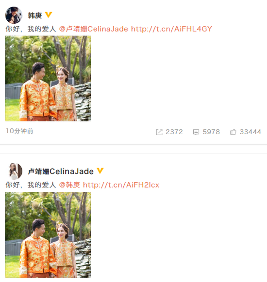 2019年最后一天的早上,夫婦二人曬出婚禮現(xiàn)場(chǎng)照,二人穿著中式禮服,甜蜜對(duì)視,還彼此發(fā)文大呼對(duì)方“我的愛人”秀恩愛。